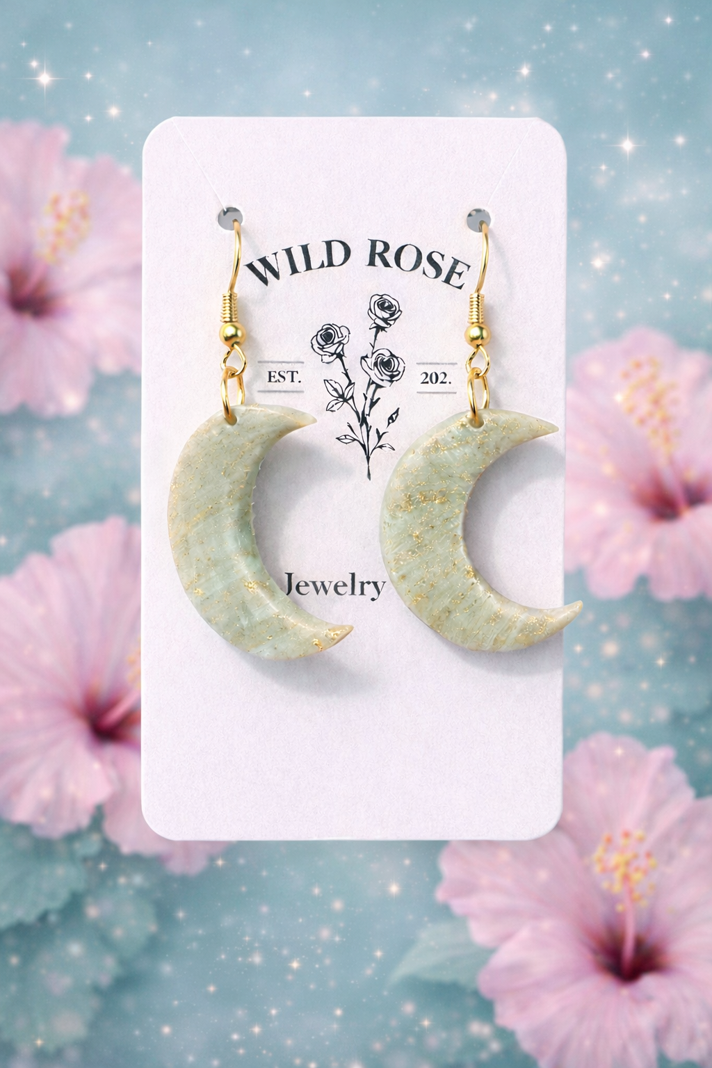 Sculpted in serene sage and sprinkled with gold flecks, Moonlit Garden captures the calm magic of a quiet night sky. These crescent moons are feminine, mystical, and effortlessly lightweight.