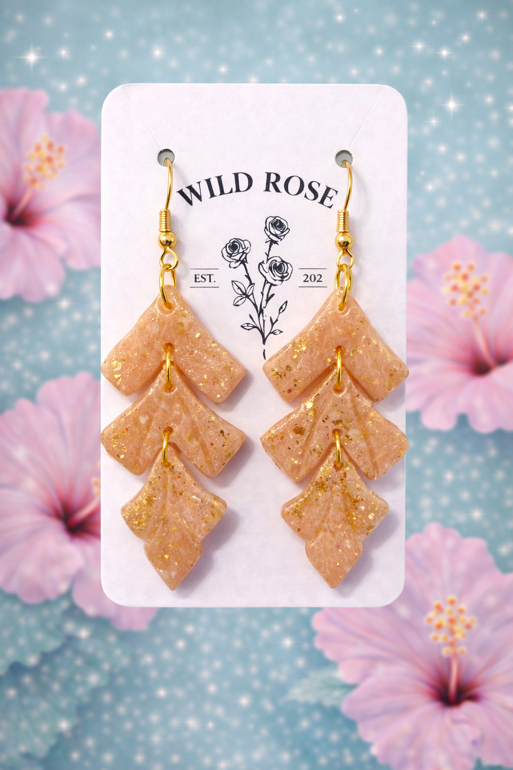 Three cascading sage leaves shimmer with gold flecks, creating a graceful movement with every step. The Leaf Cascade – Pink is soft, elegant, and beautifully sculpted — a must-have for nature lovers.