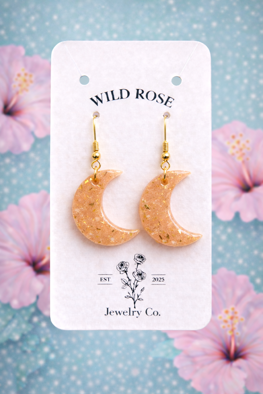 Sculpted in pink and sprinkled with gold flecks, Moonlit Garden captures the calm magic of a quiet night sky. These crescent moons are feminine, mystical, and effortlessly lightweight.